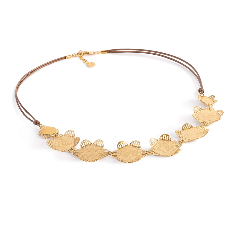 Collar. Varias piezas unidas por una cuerda. Diseño inspirado en la naturaleza y las flores.