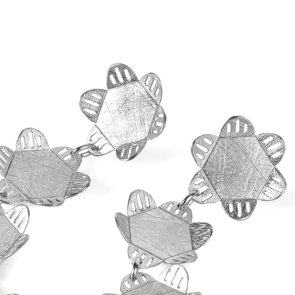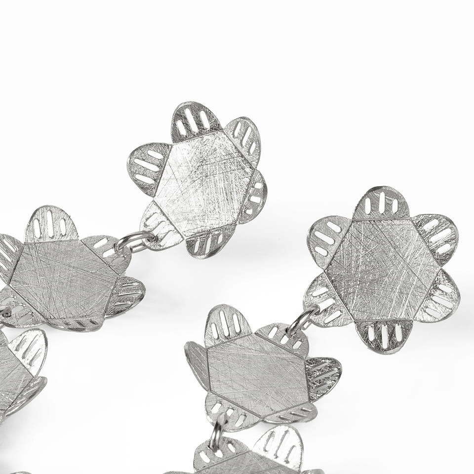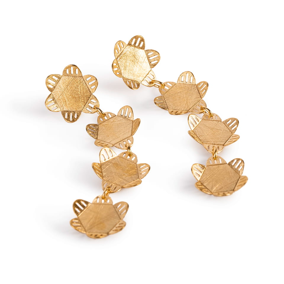 Pendientes largos articulados. Cuatro piezas unidas. Diseño inspirado en la naturaleza y las flores.