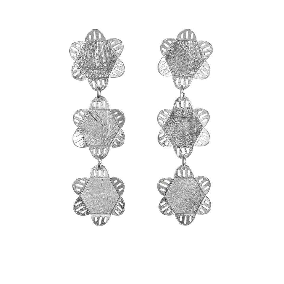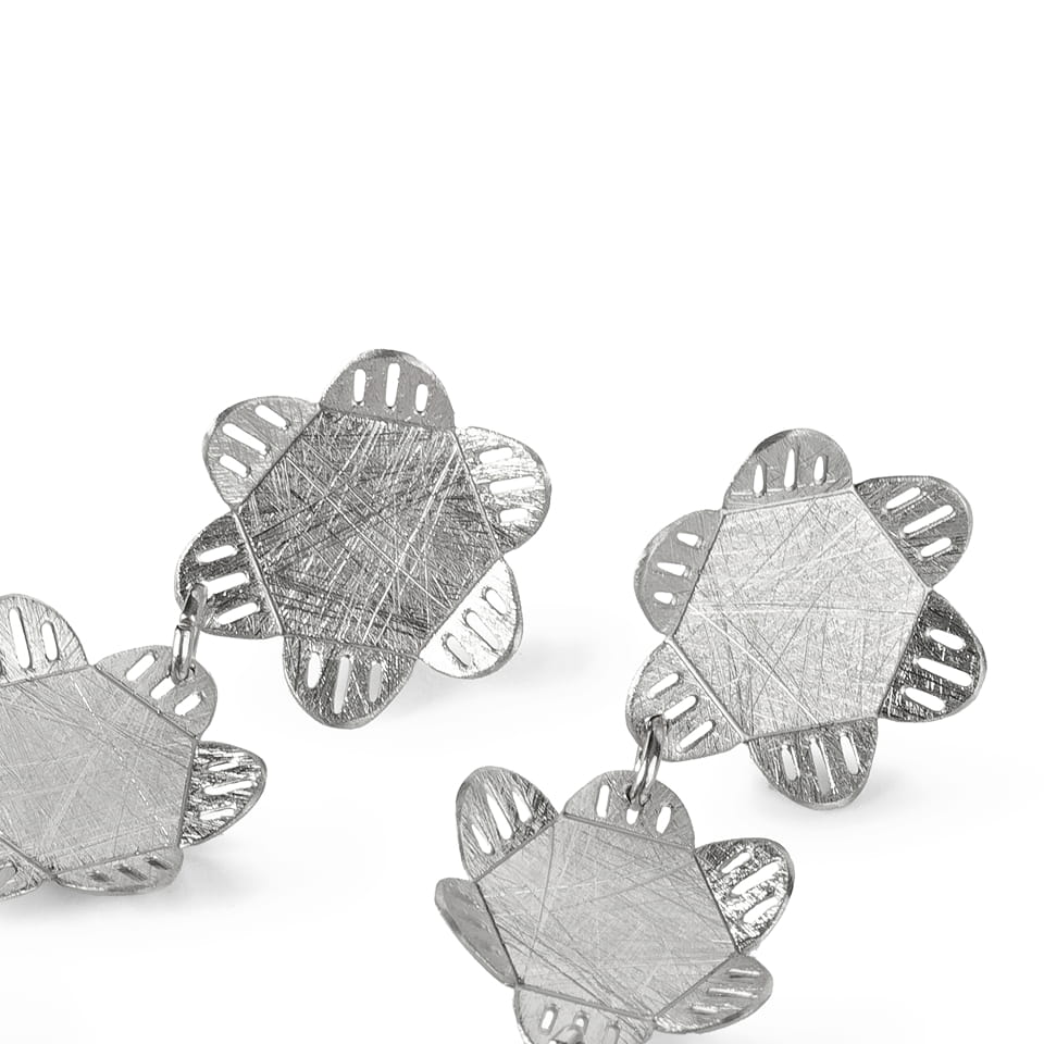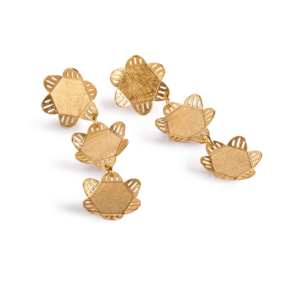 Pendientes largos articulados. Tres piezas unidas. Diseño inspirado en la naturaleza y las flores.
