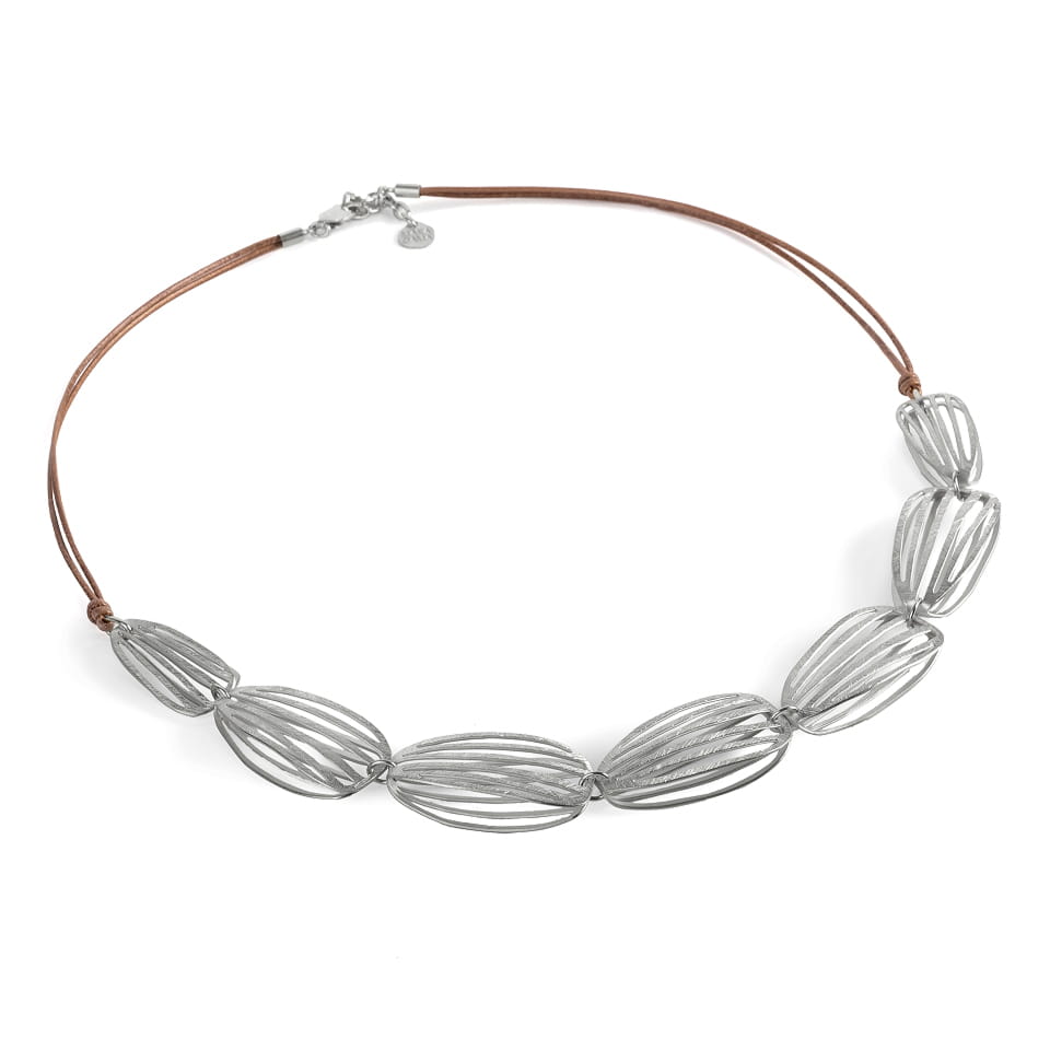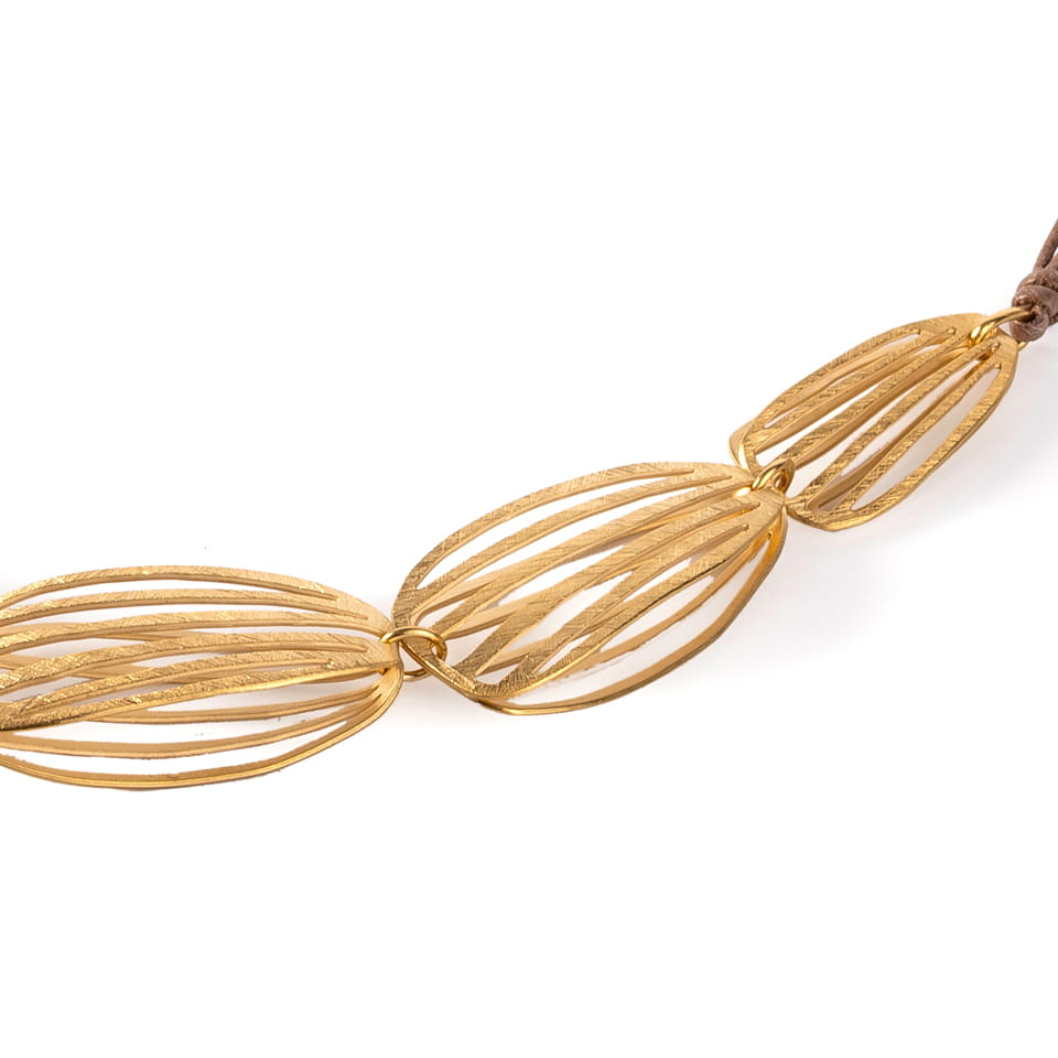 Collar con piezas unidas por cuerda. Diseño inspirado en la naturaleza y las flores.